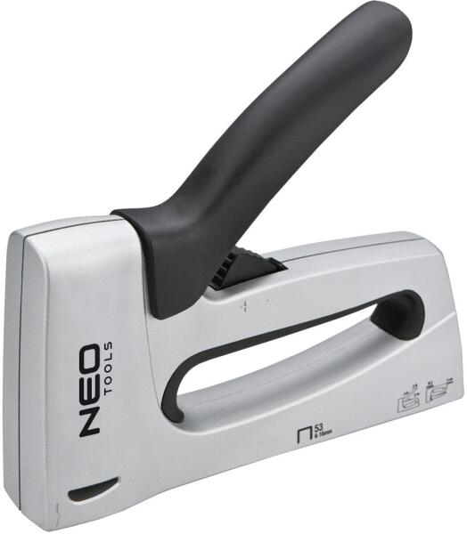 NEO kárpitos tűzőgép 6-14 mm méretű J tip. tűzőkapcsokhoz. A ház strapabíró alumínium ötvözetből készül. Az ütés szabályozhatósága lehetővé teszi a tűzőkapcsok beütését különféle szilárdságú anyagokba. Az ergonómikus, teherbíró fém markolat a kényelem növelése érdekében műanyag bevonatot kapott. A kiálló beütő lehetővé teszi a beütés helyének pontos behatárolását. Kiválóan beválik kárpitos és dekoratőri munkákban, fóliák és bőrök felerősítésében. Precízen üti be a tűzőkapcsokat azok megroggyantása nélkül, még kemény anyagokba is. A termék kiváló minőségét és megbízhatóságát bizonyítja a TÜV Rheinland tanúsítvány. A NEO márka a professzionális igényeket is kielégíti.