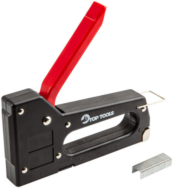 Top Tools kárpitos tűzőgép (cikkszám: 41E901) 6-8 mm méretű J tip. tűzőkapcsokhoz. Kiválóan beválik kárpitos és dekoratőri munkákban, fóliák és bőrök felerősítésében. Kárpitos tűzőgép 6-8 mm, J tip. tűzőkapocs, reteszelőgyűrű