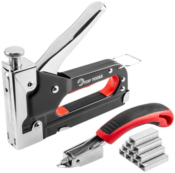 Kárpitos tűzőgép 6-14 mm, J tip. tűzőkapocs, tűzőkapocs kihúzó, fémház, ütéserő szabályozás, reteszelőgyűrű TOPEX kárpitos tűzőgép 6-14 mm méretű J tip. tűzőkapcsokhoz, J tűzőkapcsokkal és tűzőkapocs kiszedővel. A tűzőgép fémből készül, rendelkezik ütéserő szabályozással és reteszelőgyűrűvel